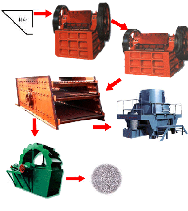 沙石生產線,砂石生產線,砂石生產線設備,砂石線,砂石生產設備基本流程:大塊石料經料倉由振動給料機均勻地送進鄂式破碎機進行粗碎,粗碎后的石料由皮帶輸送機送到反擊式破碎機進行進一步破碎;不滿足粒度要求的石子由皮帶輸送機返料送到反擊式破碎機進行再次破碎,形成閉路多次循環。細碎后的石料由皮帶輸送機送進振動篩進行篩分,篩分出幾種不同規格的石子,滿足粒度要求的石子由成品皮帶輸送機送往成品料堆;成品粒度可按照用戶的需求進行組合和分級,為保護環境,可配備輔助的除塵設備。
